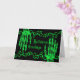 Vintage purchased clip art zombie skeleton hand illustrations in neon green and my own scrollwork on an elegant black greeting card for Halloween. All the text inside and out is customisable. The inside is decorated as well.