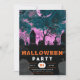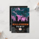 Prepare for a Halloween celebration like no other with this striking party invitation! The top half features a chilling cemetery scene set under a large crescent moon, with a grey sky adorned with twinkling stars and fluttering bats. The design bursts with vibrant neon pink and green hues, creating an otherworldly, eerie atmosphere that's perfect for setting the mood.