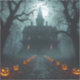 A mysterious and haunting Halloween atmosphere with a dark mansion, bats flying, and flickering jack-o'-lanterns lighting the path under a glowing moon.
