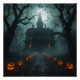 A mysterious and haunting Halloween atmosphere with a dark mansion, bats flying, and flickering jack-o'-lanterns lighting the path under a glowing moon.
