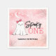 This 1st birthday party paper napkin is perfect for a girl whose birthday is near Halloween. The design features a graphic of a ghost wearing a pink bow, and is accented with the text "Spooky ONE".