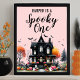 Spooky One 1st Birthday Party Sign. Welcome your guests in style with this fun and festive party sign, perfect for a little girl’s first birthday. The background is blush pink, and at the top, the phrase “Name Is A Spooky One” is displayed in a mix of playful script and simple fonts. The centre features a black and white haunted house accented with a mix of pink and orange pumpkins, jack-o’-lanterns, and spooky trees, with whimsical ghosts and bats for extra charm. Perfect for greeting guests and creating a festive Halloween birthday vibe.