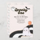 Spooky One! Retro groovy Ghost Halloween birthday party invitation in Black and orange. Spooktacular birthday bash invite with retro ghost and bats. Gost holding a balloon
