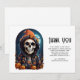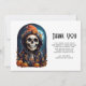 Thank you card with an illustration of a skeleton wearing a hooded jacket with an orange witch's hat on top. Surrounded by cute and spooky pumpkins. A glowing moon in the back with a single bat flying nearby. Fun autumn Halloween design or for death themed gifts parties or business.