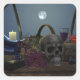 A cluttered desk bathed in moonlight contains a skull, a candle, a glass of wine, a book and various other knick-knacks.