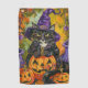 Embrace the Halloween spirit with this enchanting design featuring a cute cat in a witch hat surrounded by carved pumpkins. Perfect for adding a touch of spooky charm to your festive celebrations.