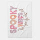 This fun and festive Halloween design features the phrase "Spooky Vibes" in a playful, dripping font that gives the text a gooey, eerie effect. The words are filled with soft, pastel shades of pink, orange, purple, and peach, adding a lighthearted and whimsical twist to the spooky theme. Beneath the text, a simple spider web illustration in a soft brown colour adds a classic Halloween touch, tying the design together. The combination of the pastel colours and the spooky elements creates a unique contrast that’s both cute and a little bit creepy, making it perfect for Halloween