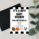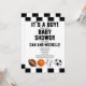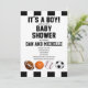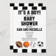 This is a sports themed baby shower invite for a boy. The design includes a baseball, basketball, soccer ball and a football. Referee themed. It's a boy! Black and white.
