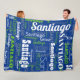 Celebrate your sports team with this sporty blue and green repeating name graffiti pattern stadium blanket with modern typography in shades of sporty blue, sporty green, white, and sporty grey with your names in a variation of different fonts. Great gift for the sports lover from Seattle, or for the baby shower and the new baby of a sports family! This blanket is perfect to take with you on cool nights on the sports field!