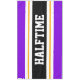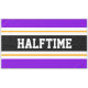 This sporty, athletic design features bold HALFTIME text inside a highlighted wide black stripe with golden yellow and white racing stripes against bright purple outer stripes. The text can be personalised.