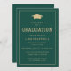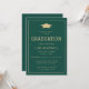 This simple, modern graduation party invitation features gold-coloured text topped with a gold mortar board cap silhouetted on a dark green background. The word "Graduation" appears in a classic sporty typeface ideal for a student athlete. Customise the invitation with the name of the graduate and the party details. The back of the card is solid green.