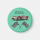 A sporty race car with chequered flags below on a green backdrop where on top is where you can personalise it with a name making it uniquely your own. Fun sporty vibes.