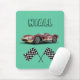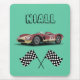 A sporty race car with a green backdrop and chequered race flags below and on top an area where you can personalise it to make it uniquely your own. Boyish fast car vibes.