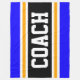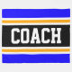 This sporty, athletic design features bold COACH text inside a highlighted wide black stripe with double white and yellow racing stripes against bright outer stripes. The text can be personalised.