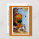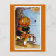 Vintage Halloween greeting card illustration of a Pumpkin Girl frightened by ghosts and a spider.