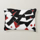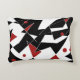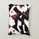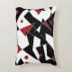 Various white and red geometric shapes are scattered across a black background, creating a stark contrast. Some shapes are interconnected with thin white lines, and red dots add a pop of colour to the composition.