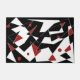 Various white and red geometric shapes are scattered across a black background, creating a stark contrast. Some shapes are interconnected with thin white lines, and red dots add a pop of colour to the composition.