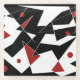 Various white and red geometric shapes are scattered across a black background, creating a stark contrast. Some shapes are interconnected with thin white lines, and red dots add a pop of colour to the composition.