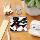 Various white and red geometric shapes are scattered across a black background, creating a stark contrast. Some shapes are interconnected with thin white lines, and red dots add a pop of colour to the composition.