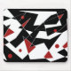 Various white and red geometric shapes are scattered across a black background, creating a stark contrast. Some shapes are interconnected with thin white lines, and red dots add a pop of colour to the composition.