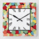 10.75” x 10.75” square acrylic wall clock with a fun retro image of red, orange, yellow, green, and blue spots on black and a Roman numeral clock face in a white square with a black border. See the entire Nifty 50s Clock collection in the DECOR | Clocks section.