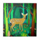 Ceramic tile in a stylised illustration of a cute, spotted fawn in a fairytale forest setting, surrounded by trees and plants, in shades of brown and green