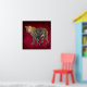 A beautiful spotted leopard with intense yellow eyes. Set on a regal red background.