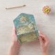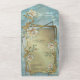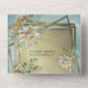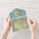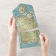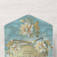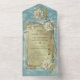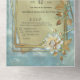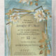A light blue palette is in front of a copper/bronze Barogue-style background pattern. Cards are decorated with cream flowers and gold leaves over a gold-shaped frame for your unique all in one invitation.