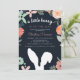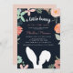 Adorable spring themed baby shower invitations for your little bunny on the way feature a boho floral border and a white bunny ears silhouette against a rich navy blue background.