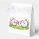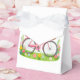 This charming and vibrant design features a cute pink bicycle overflowing with colourful flowers in its front basket and a smaller basket on the back. A sweet little bird is perched on the bicycle seat, adding to the whimsical scene. The bike is situated in a lush green meadow dotted with various cheerful blossoms, evoking feelings of spring, nature, and leisurely rides. Perfect for adding a touch of joy and freshness to any product or project.
