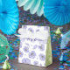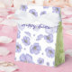 This favour box is blooming with delicate purple flowers, on a white background. The side panels are light green with dark green foliage. The text can be customised.