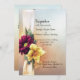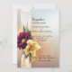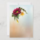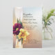 Lovely Spring inspired wedding invitation done in a peach and light blue mottled background. Beautiful graphics of a pale yellow ribbon, running down the left side, is decorated with a yellow daffodil and a maroon coloured daisy like flower. Black text is ready to personalise for your special day. Matching products are available.