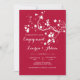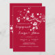 This scarlet background features a striking branch of white spring blossoms. Featured as an engagement invitation, it is well-suited for any happy occasion. Also fitting for Valentine's Day birthdays and celebrations.