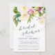 Elegant and modern floral bridal shower invitation features a bouquet of ethereal pastel watercolor flowers in shades cream and blush pink, with lush green botanical accents. Personalise with your bridal shower details in elegant midnight blue typography accented with handwritten style calligraphy. Cards reverse to solid jasper green.
