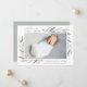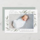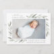 Elegant botanical birth announcement in chic pastel colours features a single full bleed horizontal or landscape orientated photo with clusters of delicate pale green watercolor leaves at the corners. Personalise with baby's name, birth stats, and a personal message, and add three additional square photos to the back.