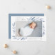 Elegant botanical birth announcement in chic pastel colours features a single full bleed horizontal or landscape orientated photo with clusters of delicate pale dusty blue watercolor leaves at the corners. Personalise with baby's name, birth stats, and a personal message, and add three additional square photos to the back.