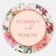 Pretty wedding sticker, round with peach and ivory background, and a lovely floral edging.