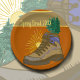 This original design is by artist KG Nowak. The illustration includes a hiking boot with a grove of pine trees emerging above. The sun rises by the laces.