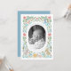 Hand-drawn flowers and leaf border with birds, snails and bunnies, over custom colour. Add more text or photos to the back if desired. Also available in foil.