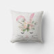 Cute bunny face with pink ears, eyelashes, and spring flower bouquet on whitewashed wood background.