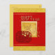 Red Ox paper-cut (printed image) on the corner of an Asian painting with greeting in English in the top (gold lettering and drop shadow not customisable).. Design on holiday postcard with golden textured paper image as background + small vertical 2021 to customise if you want.