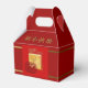 Red Ox paper-cut on Asian painting with greeting in English in front (gold lettering and drop shadow not customisable) + Chinese greeting. Design on Gable favour box. You can easily change background colour by clicking the customise button. Available in other styles of favour boxes (cube, tent, take-out). Matching gift bag, greeting card, postcard and other craft products. Perfect for Chinese New Year of The Ox 2021.