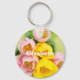 A bouquet of tulips in pink and yellow on a pastel green table. Template for your name.