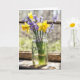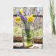 Yellow daffodils and purple flowers in a mason jar by rustic farmhouse window.