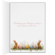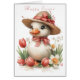 Adorable, white Easter Duckling wearing a pretty, Spring, straw hat with pretty flowers and pink satin bow. She also has a dark pink bow around her neck and is sitting in a garden full of pretty Daffodils and Tulips. The inside has a cute greeting and Bunnies sitting in a field of colourful Spring flowers.