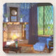 A cosy reading corner on a sunny spring day. Warm sunlight streams in through the lattice windows, leaving shadows on the wall and lighting up the cherry blossom "snowglobe" on the bookshelf. In the window is a colourful suncatcher sparkling in the light. Around the hearth are cushy armchairs, with vases of flowers and books and a steaming teacup, but the windows are open to let in the spring breeze. Outside a spring-green willow and beech hedge and red Japanese maple are surrounded by tulips and cornflowers, while a ginger cat stalks through the long grass.