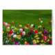 Spring flower border filled with tulips and narcissi with a lush green lawn.