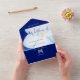 Wedding Invitation with Snow-white flower on bright blue clearance water background, azure teal watercolor painting, airy coloured spring or summer spotted floral background. White lily botanical elegant floral blossom Wedding Invitation. Spring Fondness Collection.