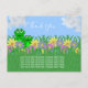 Two cute little frogs sitting amongst colourful flower, under blue sky surrounded by lots green grass.