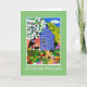 A colourful Easter Greeting Card, with 'Happy Easter' in French, and a garden in springtime, with a blue garden shed, a blossom tree, tulips and daffodils and cat, lazing in the sun, watching the blackbirds, from a handpainted paper collage by Judy Adamson. The inside is left blank for your own message.